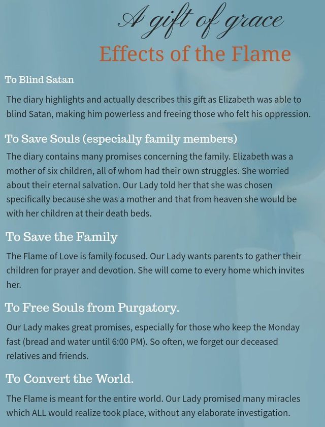 “Mary: “From now on, any time you pray to Me, add the following request: Mother of God, spread the effect of grace of Thy Flame of Love over all of humanity, now and at the hour of our death. Amen. With this prayer, you will blind Satan.” - Mary: ‘This Flame of Graces coming from My Immaculate Heart must go from heart to heart. It will be the Great Miracle whose Light will blind Satan. It is the Fire of Love and of the Union. We shall fight fire with fire: the fire of hate with the Fire of Love! I obtained this Grace from the Eternal Father on your behalf by virtue of the Five Blessed Wounds of My Divine Son.’Promise: “Whoever prays three Hail Mary in honour of My Flame of Love delivers a soul from Purgatory. Whoever prays one Hail Mary in honour of My Flame of Love during the month of November, delivers 10 souls from Purgatory.” ”